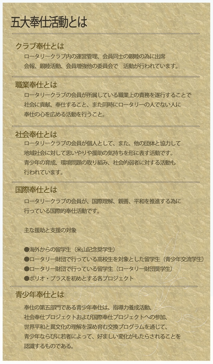 ロータリアン共通の目的や指針として、長い年月をかけて形づくられたものです。